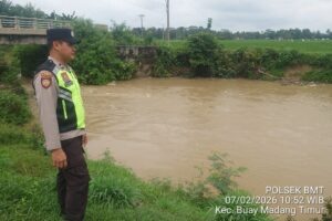 OKU Timur – Polsek Buay Madang Timur melaksanakan kegiatan monitoring debit air Sungai Macak di Desa Kedu, Kecamatan Buay Madang Timur, Kabupaten OKU Timur, Sabtu (7/2/2026) sekitar pukul 10.30 WIB. Kegiatan ini dilakukan sebagai langkah antisipasi menyusul tingginya intensitas curah hujan yang terjadi beberapa hari terakhir.